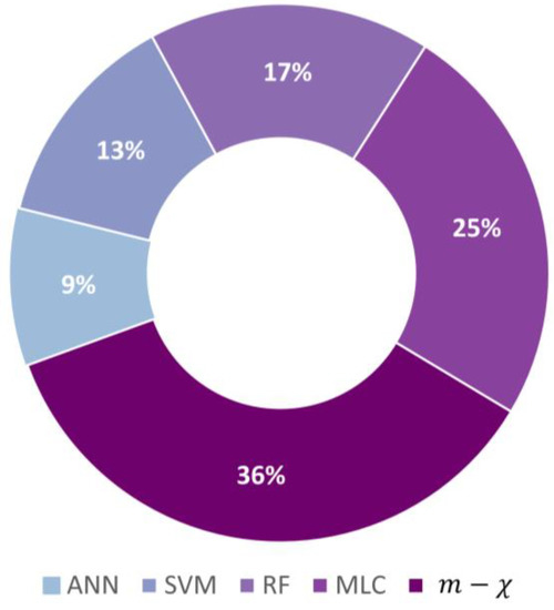 A summary of using different classification methods in CP studies is shown in Figure 11. The most common classification method applied in compact polarimetry studies is the method at 36%. This is followed by the maximum likelihood classifier (MLC) at 25%, random forest classification at 17%, and Support Vector Machine (SVM) at 13%. At 9%, Artificial Neural Network (ANN) is the least commonly applied classification method in the reviewed studies.