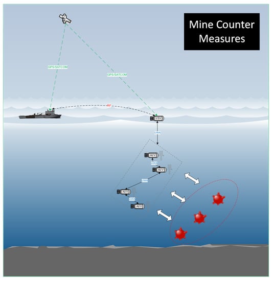 Mine Counter Measure use case. The Autonomous Underwater Vehicles (AUVs) communicate over acoustic channels, reporting collected data back to the command station through an Unmanned Surface Vehicle (USV). This surface vehicle is localised via GPS.