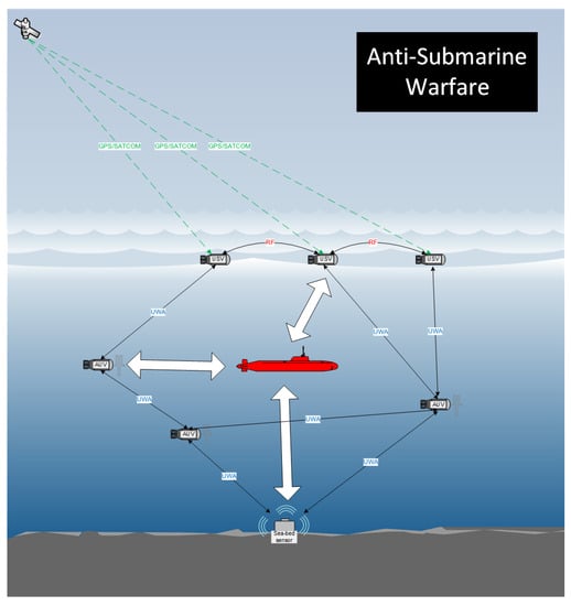 Anti-Submarine Warfare use case. A network of USVs identifies a hostile platform, and informs a remote command post via satellite link.