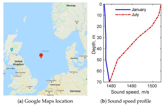 In addition to being slow, the propagation speed of acoustic waves depends on the temperature, pressure and salinity of the water and is, therefore, variable in space and time [26]. Figure 3 shows an example of two sound speed profiles (SSPs) derived by Dushaw [27] from the 2009 World Ocean Atlas data for January and July, both in the North Sea at (55.5 N, 2.5 E). In this example (relatively shallow water), the water temperature is a dominant parameter affecting the sound speed, introducing considerable variability in the SSP between January and July. Since the water near the sea surface is warmer in July, there is a distinct negative sound speed gradient caused by this thermocline. Such variations in the sound speed at different depths cause refraction of acoustic waves towards the lower sound speed region. This, in turn, results in curved propagation trajectories that may sometimes form waveguides or deep sounds channels around a particular depth (where the sound speed is at its minimum). For example, the SSPs shown in Figure 3b cause downwards refraction towards the seabed in July but a slight upwards refraction in January, which can have a considerable impact on the network connectivity and the link quality.