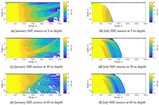 Figure 4 shows how the spatial distribution of the UWA channel quality may vary, depending on the SSP and the location of the source in the water column. The contour plots show the Signal-to-Noise Ratio (SNR) computed using the channel modelling framework described in [28] based on BELLHOP beam tracing [29] with randomly generated surface waves and the January and July SSPs from Figure 3b. The outputs of BELLHOP were post-processed using a 24 kHz centre frequency and 7.2 kHz bandwidth, i.e., representative of typical wideband UWA transmissions [30], by integrating the absorption loss for every traced multipath component across the whole frequency band to yield the wideband received signal power (see [28]). The SNR values were computed by dividing the wideband received signal power by the noise power calculated using the ambient UWA noise model in [31], assuming 10 m/s wind speed, 0.5 shipping activity factor, 24 kHz centre frequency and 7.2 kHz bandwidth.