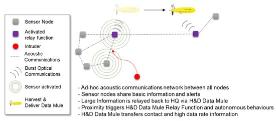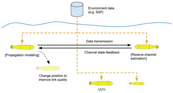 Figure 5 depicts our envisaged adaptability of the subsea networks to the UWA channel conditions, subject to the constraints of other autonomous missions running concurrently on the AUVs. For example, in the MCM use case, the nodes’ primary mission is that of collecting data on the targets and to transmit relevant information to the survey vessel as soon as possible. These two, potentially conflicting, objectives have to be balanced out so that the network nodes (the AUVs) would have the capability to alter their course/mission to boost the quality of inter-node communication whenever needed. This can be based on the combination of the following: