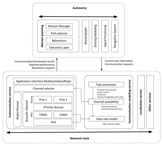 A different approach considers the autonomy and the communication systems as mutually interacting entities rather than being independent. As operations with multiple AUVs become more common, a lot of effort is directed towards finding solutions to increase the mission efficiency in terms of time and quality of the data collected. In this regard, sharing information across autonomy and communication layers can be very beneficial. First of all, providing the decision-making process with a holistic view of the mission evolution allows a broader definition of the mission objectives, including parameters such as desired communication performance, minimisation of the navigational drift, etc. Furthermore, a mission-/task-aware communication system can improve the channel usage to optimise the throughput of the network, e.g., adjusting the routing paths to include vehicles within communication range only. Moving in this direction, authors in [22] propose to run an acoustic model in real-time to provide estimates of the acoustic environment under changing environmental and situational scenarios. While the output of the model is combined together with other mission objectives to maintain point-to-point acoustic connectivity throughout the mission, there is not explicit aim to tackle the problem at network level, when more than two nodes are present. Another example of interaction between autonomy and communications is the one proposed in [6]. In this case, the acoustic network is able to provide additional, autonomy oriented, services, namely localisation and navigation. The localisation capability is added on top of an existing network, without imposing constraints on its structure and operation, and to support AUV navigation without constraining the network design and with a minimum communication overhead.