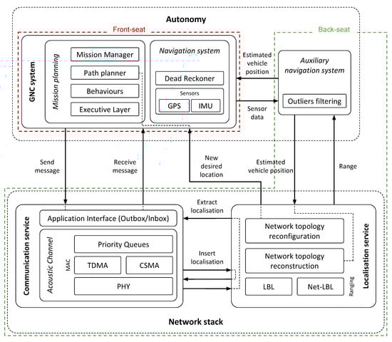 The front-seat represents the vital part of the system and provides the vehicle with core components, such as mission planning, control, navigation, health and safety checks. On the other hand, the back-seat allows the system to be extended with additional, custom algorithms purposely designed to fit specific mission requirements, without affecting the safety of the vehicle. The intrinsic modularity of this framework facilitates the decomposition of the whole system into sub-modules, emphasising more the definition of interactions and interfaces between the different components rather than the distinctive features of the single entity.