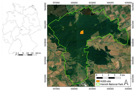Overview of the study area. The Hainich National Park is located in the center of Germany. The Huss supersite is part of the core area of the park. The satellite imagery in the backdrop is taken from Google Earth (2020). The coordinate system used for all figures of this paper is universal transverse mercator (UTM), zone 32N, ellipsoid WGS84.