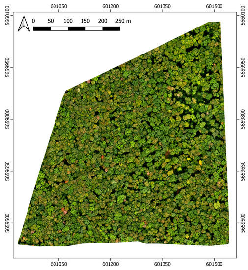 The Huss site in September 2019. The dimensions of the site are approximately 550 m × 550 m. However, its footprint is not exactly square, resulting in an area of 28.2 ha. Only deciduous tree species occur. The gaps in the canopy are caused by natural processes such as wind throw or the death of old tree individuals etc. Since the forest is not managed, the dead wood remains on the forest floor until it decomposes completely. The dense canopy hardly permits woody undergrowth. Displayed data: Orthomosaic based on unmanned aerial systems (UAS) imagery. The data shown in this figure were acquired under leaf-on conditions on 20 August 2019 and are solely used for visualization purposes.