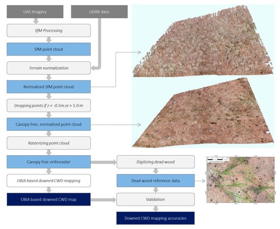 The introduction clarified the great importance of CWD in natural and commercial forests. It was also shown which difficulties and challenges still exist regarding CWD mapping. Furthermore, the literature review reveals that most of the studies on CWD mapping have been conducted in boreal and hemiboreal forests and employ laser data. Although UAS imagery might have a great potential for CWD mapping, as discussed in the previous sections, there is a lack of studies that investigate the potential of such data for CWD mapping. Consequently, this study addresses these open questions. The overall goal of this research is to develop and validate a cost-effective and flexible approach to CWD mapping for deciduous forests that can be used to support forest inventories. We suggest a novel end-to-end approach using UAS optical imagery and SfM to map CWD underneath a forest canopy. The workflow exploits the three-dimensionality of the SfM point cloud to eliminate elements preventing an unobstructed vision of the forest floor.