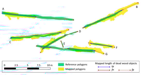 Mapped and manually digitized CWD for a small subset of the Huss site to illustrate the length-based accuracy analysis approach. Seven dead wood objects are shown (A–G). The length of the overlap area of reference polygons and mapped polygons corresponding to the same CWD object (solid blue lines) was defined as correctly detected (tp length). Missed out parts of CWD objects (solid red lines) correspond to fn length, while dotted red lines refer to overestimation (fp length). The length measurements were summed up for the entire validation area (one fourth of the Huss site).