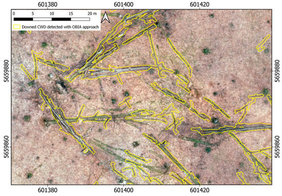 Subset of Figure 8 providing a detailed view of the mapped CWD. According to the map, the majority of the dead wood was detected, even though the object shapes do not match the dead wood boundaries precisely for all examples. Since the mapping method was designed to detect linear features, confusion between CWD and standing stems was avoided.