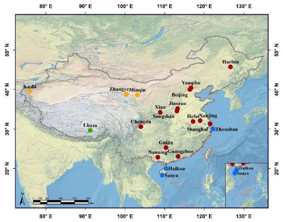 SONET provides a long-term dataset of columnar atmospheric aerosol properties over China dating back to 2009 [,]. There are 20 long-term (>1 year) observation stations by 2019 (Table 1) and dozens of temporary (a few days to several months) observation stations within the SONET. In this study, aerosol direct radiative effects are estimated based on the measurements at the 20 long-term stations, which are grouped into four types (i.e., the arid and semi-arid sites, the continental background site, the urban and suburban sites, and the coastal sites), according to their geographical locations, climate, and aerosol characteristics (see Figure 1).Based on the comprehensive climatology study of the aerosol optical, physical, chemical, and radiative properties in previous researches [,], the arid and semi-arid sites (Minqin, Zhangye, and Kashi) are mainly dominated by the mineral dust aerosol particles. The continental background site (Lhasa) is also dominated by coarse mode particles, but with very low total mass concentration. The urban and suburban sites that account for the majority in SONET are identified as urban–industrial aerosols (Beijing, Yanqihu, Jiaozuo, Harbin, Hefei, Nanjing, Chengdu, Guilin, and Nanning), the mixtures of urban–industrial aerosols and dust aerosols (Songshan and Xian), as well as the mixtures of urban–industrial aerosols and marine aerosols (Shanghai and Guangzhou). Although the marine aerosols are prevailing in some seasons at the coastal sites (Sanya, Haikou, and Zhoushan), the influences of urban–industrial aerosols are also obvious; so, they are identified as the mixtures of marine aerosols and urban–industrial aerosols at the coastal sites as well [].