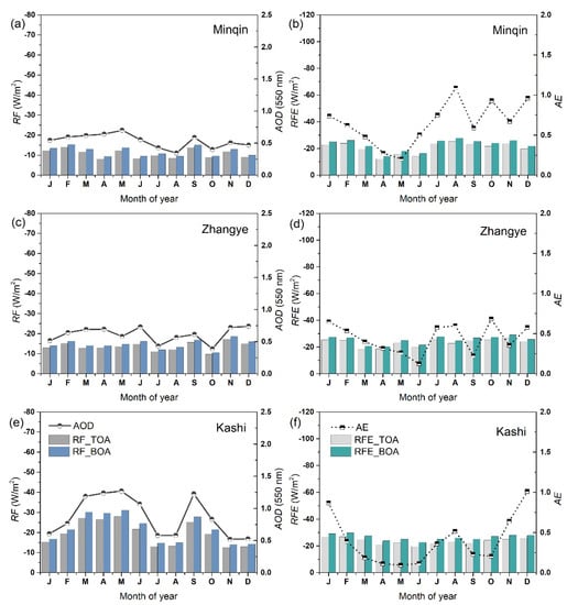 Multi-year monthly average aerosol radiative forcing (RF) and efficiencies (RFE) and corresponding aerosol optical depth (AOD) at 550 nm and Ångström exponent (AE) (440–870 nm) at the SONET arid and semi-arid sites. (a,b) Minqin; (c,d) Zhangye; (e,f) Kashi.