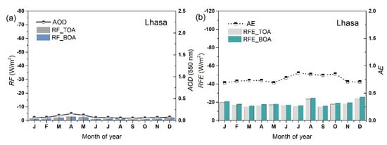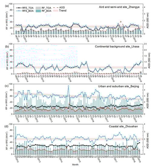 The variations of monthly average aerosol RF and RFE at the four types of selected sites with long-term observations lasted more than five years (including the arid and semi-arid site Zhangye, the continental background site Lhasa, the urban and suburban site Beijing, and the coastal site Zhoushan) are illustrated in Figure 6. Almost only negative monthly average values of RF and RFE, indicating mainly cooling effects of aerosol particles at the four types of sites, were estimated both at TOA and BOA. In addition, the RFs at BOA were always stronger than those at TOA (i.e., the differences between RFs at TOA and BOA were positive), suggesting the warming effects within the entire atmospheric column at the four types of sites. However, the intensities of the warming effects in the atmosphere were significantly different, which can be divided into two distinct groups (i.e., Zhangye and Lhasa in one group, Beijing and Zhoushan in another group). The former group is located at the arid, semi-arid, and continental background sites with very weak aerosol warming effects in the atmosphere and less warming efficiency (the differences between RFE at TOA and BOA were less than 5.8 W/m2 at Zhangye and less than 1.9 W/m2 at Lhasa). The latter group is located at the urban, suburban, and coastal sites with strong effects and more efficiency to warm the atmosphere (the differences between RFE at TOA and BOA reached up to 74.1 W/m2 at Beijing, and 49.0 W/m2 at Zhoushan). This can be partly attributed to dominant aerosol components at different types of sites. Previous study has illustrated that the fine-mode black carbon (BC) and brown carbon (BrC) components (with strong light absorbing effects to heat the atmosphere) at the urban, suburban, and coastal sites within SONET are obviously higher than those at the arid, semi-arid, and the continental background sites []. Then, fine-mode dominant aerosols at urban, suburban, and coastal sites were more efficient in warming the atmosphere (with large difference between RFE at TOA and BOA), in comparison to the coarse-mode dominant aerosols at arid, semi-arid, and continental background sites.