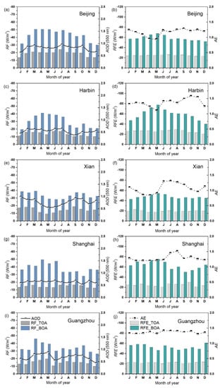 For the same urban station, the annual cycles of RF at the top and bottom of atmosphere had similar patterns roughly correlated with the variations of AOD. They exhibited different monthly variations at different stations, especially clear for the RF at BOA. At Beijing, the effects of radiative forcing at BOA from November to January were obviously weaker than other months. At Shanghai and Guangzhou, the effects of radiative forcing at BOA were stronger from April to June, and from March to May, respectively. The absolute RF values at BOA were high from March to July at Harbin. Generally, the strongest cooling effects can be seen in spring for most of these urban sites (including Beijing, Harbin, Shanghai, and Guangzhou). In contrast, the negative RF values at BOA at Xian reached peak from January to March, which were in the heating season with enhanced anthropogenic influences (e.g., high emissions owing to coal consumption). There was no obvious monthly variation for the RFE at TOA, but the monthly patterns can also be observed in RFE at BOA at some urban sites. As a qualitative indicator of aerosol particle size, high AE values (mostly greater than 1.0) indicated aerosol particles at these urban sites were mainly dominated by fine particles. Weak negative correlations can be roughly observed between the RFE at BOA and AE at the five urban sites, but the correlation cannot be found at the arid, semi-arid, and continental background sites.