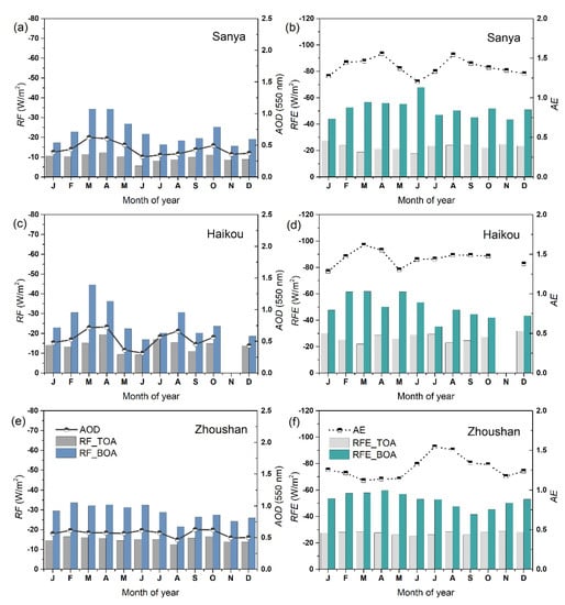The Sanya, Haikou, and Zhoushan sites are located in the coastal region, which are influenced not only by marine aerosol particles, but also by urban–industrial aerosol particles originating from cities or towns nearby. From Figure 5, the multi-year monthly average values of AE (440–870 nm) at the coastal sites (>1.1) were comparable with the urban and suburban sites (see Figure 4), indicating that they were also dominated by fine-mode particles other than the coarse-mode sea salt particles. The three coastal sites showed high aerosol loading with AOD at 550 nm wavelength, changing around 0.5 during the whole year, which was also approximate to some urban and suburban sites. At the coastal sites, the multi-year monthly average values of RF varied from −5.5 W/m2 to −19.5 W/m2 at TOA, and from −15.6 W/m2 to −44.6 W/m2 at BOA. The monthly variations of RF at BOA were obvious at Sanya and Haikou, with the main peak in spring and secondary peak in October or August, corresponding to the changes of AOD. However, for radiative effects at Zhoushan, there was no obvious monthly change, especially for the RF at TOA. The values of RFE showed different variations during the whole year, in comparison with RF at the coastal sites. They roughly appeared as negative correlations with AE, just like the urban and suburban sites. The RFE multi-year monthly averages at TOA (from −17.6 W/m2 to −30.0 W/m2) and at BOA (−35.2 W/m2 to −67.9 W/m2) also presented large differences (up to 50.2 W/m2).