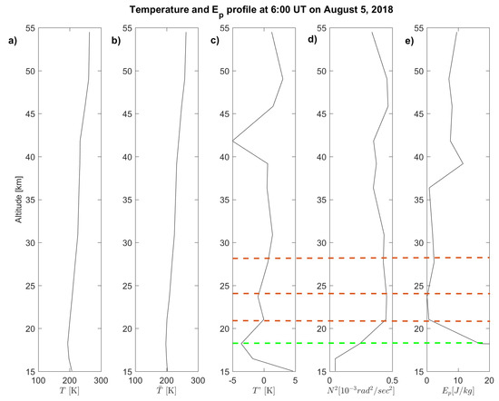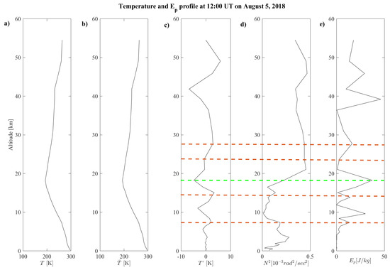 Figure 5d,e are the squared term of the frequency and the resulted AGW potential energy. Additionally, in this case, as expected [67], we found that the temperature value reached its absolutely maximum at the tropopause (∼17 km). shows clear waves identified between 21 km and 37 km, whose peaks are at 21.3, 24.1, and 27.3 km, respectively. The maximization of at this altitude confirms the injection of AGW, whose estimated vertical wavelength is ∼3 km.
