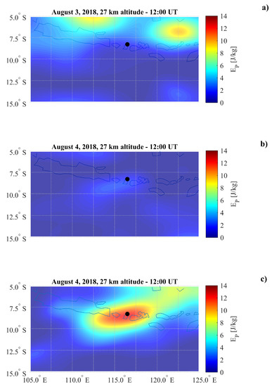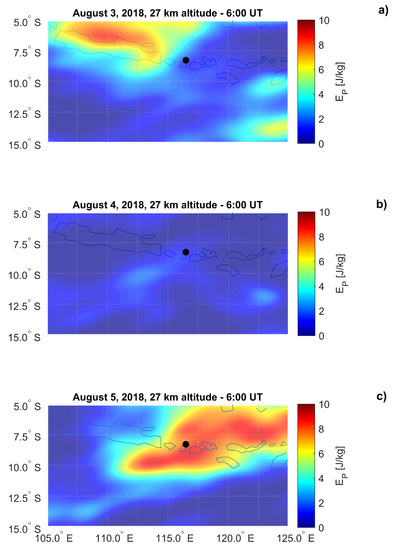 To further check the wave activity around the EE, we evaluated the horizontal distribution of the from 3 to 5 August 2018 (Figure 2). The altitude of these maps was fixed at 27 km, corresponding to the maximum potential energy values between the tropopause (∼17 km) and the stratopause (∼40 km). On 3 August 2018, a clear AGW activity (panel a) is visible at lower latitudes than the EE, caused by a cold front associated with the arrival of a cyclone passing the northern part of Indonesia. On the contrary, 4 August 2018 presents a relatively calm state around the EE (panel b). Interestingly, a strong increase in (panel c) is clearly visible on 5 August 2018 over the EE (black circle), with respect to both of the previous days. The horizontal wavelength of the wave activity (7–11 in longitude) was ∼700–1200 km. Such values are consistent with previous results in Gokhberg and Shalimov [68], Mareev et al. [69] and more recently in Yang et al. [29] who found horizontal AGW wavelength associated to EQ or explosions between 400–1000 km.