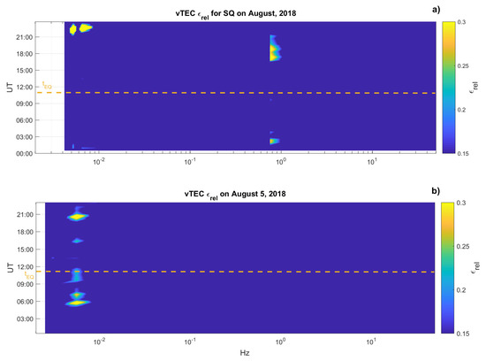 vTEC relative energy spectrogram evaluated over the earthquake epicenter. Panel (a) vTEC relative energy background for solar quiet conditions for August 2018; panel (b) vTEC relative energy evaluated on 5 August 2018. Colors are representative of the values. The yellow dashed line represents the time of the earthquake occurrence.