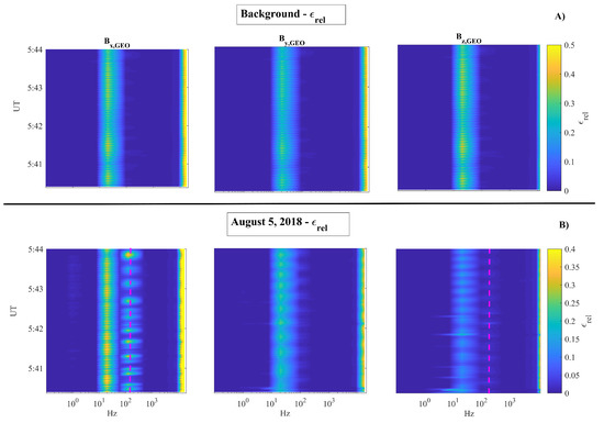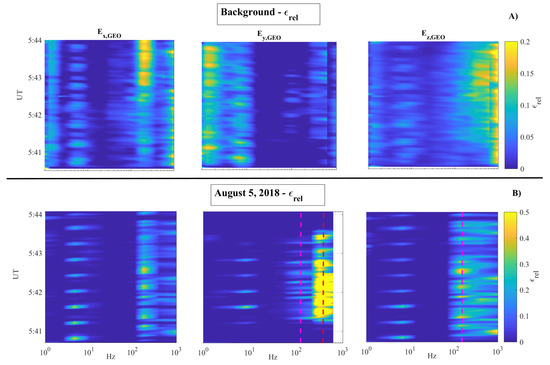 Figure 7A shows the electric field background for the geographic North–South (, left panel), East–West (, middle panel) and vertical (, right panel) components. A clear signature of the ionospheric Schumann resonance at ∼7.9 Hz is visible in all components [74]. The peaks detected at a frequency of around 2 Hz are due to the electric field, induced by the motion of the satellite with a velocity into a magnetic field B. The peak around 1 kHz, in both and , can be related to the signature of the plasmaspheric hiss [75,76]. Finally, the peak around 270 Hz along is a portion of the whistler mode chorus generated around propagating into the plasmasphere [77,78]. Figure 7B shows the relative energy evaluated for 5 August 2018. As expected, the Schumann resonance peak at ∼7.9 Hz is clearly visible in all components. Interestingly, anomalous peaks at ∼180 Hz along and (magenta vertical dashed lines), and at ∼630 Hz along (red vertical dashed lines) can be easily identified with respect to the background.
