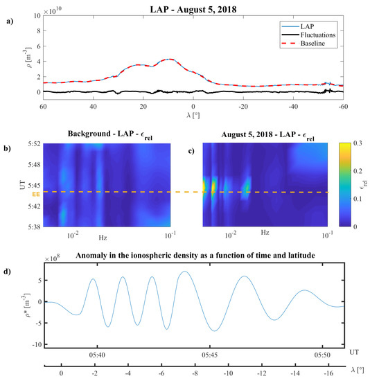 Figure 9a shows the CSES LAP data (blue line) for the entire selected semi-orbit (Figure S1 in the Supplementary Material).As expected for solar quiet conditions, the density presents a local maximum around the magnetic equator and greatest variations at high latitudes [80]. In order to find possible low amplitude variations (with respect to the long term trend value) switching on over the EQ cell, we removed the long term trend (red line) and analyzed the plasma density fluctuations (black line) using FIF. Figure 9b,c show the LAP background relative energy evaluated from August 2018 to November 2019 for solar quiet conditions and 5 August 2018 , respectively. Two anomalous density components switched on between 5:39 ± 00:02 UT and 05:50 ± 00:02 UT characterized by s and s peculiar periods.
