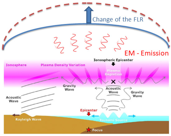 In the last few years, there has been an increasing interest in the scientific community towards the short-term forecasting of earthquakes (EQs), since many anomalies, statistically correlated with a seismic activity, have been found in the atmosphere and ionosphere, rather than in the lithosphere [1,2,3]. Ionospheric plasma density perturbations, occurring in its lower-side [4], as well as in its upper-side [5], give the most promising results. As a consequence, a few hypotheses have been introduced in order to justify the coupling among lithosphere, atmosphere and ionosphere. The first one, which is based on the chemical transmission, hypothesizes that the atmospheric conductivity can be perturbed by radon outflow close to the earthquake epicenter (EE), leading to a modification of the atmospheric electric field that drives a variation in the ionospheric plasma density profile [6,7,8]. The second one is based on the emission of atmospheric acoustic gravity waves (AGWs). Namely, such oscillations, developing around the EE, perturb the atmosphere in terms of changes in temperature, pressure, ground motion, etc. AGWs can propagate upward and, thus, can drive disturbances in the ionosphere [9,10,11,12]. The third one is electrostatic transmission. Basically, an electrostatic effect is produced in the lithosphere and released in the lower atmosphere by “stress-induced positive holes” which alter the ionospheric ionization status [13,14]. Nonetheless, because of the insufficient amount of experimental evidence supporting those theories, there are many other aspects of the lithosphere–atmosphere–ionosphere coupling process that cannot be explained yet [3,15,16]. In this scenario, models based on AGWs emission seems to provide the most promising results to correctly understand the lithosphere–atmosphere–ionosphere coupling processes in concomitance with an EQ. In fact, many studies using sub-ionospheric soundings through very low frequency/extreme low frequency band before and during a seismic event support the AGW hypothesis—e.g., in [2,4,9,11,17]. Anyway, it has to be stressed that all these observations give no information on the lithosphere/atmosphere coupling mechanisms, since only the lower ionosphere is studied. As a consequence, in recent years, many works hunted for a possible link in the lithosphere–atmosphere–ionosphere system during active seismic conditions. The authors in Korepanov et al. [18], investigating surface atmospheric pressure and magnetic field data during meteorological events, concluded that AGWs are a possible candidate for seismo-ionospheric coupling. A similar study by Nakamura et al. [19] for the 2004 Niigata-Chuetsu EQ (M6.8), using wavelet analyses, confirmed that enhanced variations in the period of 10–100 min of the surface atmospheric pressure and magnetic field data (which are in the range of AGW) enhanced the lower ionosphere perturbation. The authors in Endo et al. [20], using the Japanese F-net wide-band seismic network data, found that, before the 2007 Niigata-Chuetsu Oki and 2008 Iwate-Miyagi EQs, the ground motions in the AGW ranges were enhanced when the lower ionosphere was perturbed. Moreover, the analysis of the crustal motion based on the Global Positioning System data during the 2011 Tohoku EQ suggested a direct time-correlation with very low frequency/extreme low frequency sub-ionospheric and ultra-low frequency magnetic field variations—e.g., in [21,22,23,24]. To conclude, the literature mentioned above provides some evidence on the coupling among lithosphere, lower atmosphere, and ionosphere via the AGW channel.