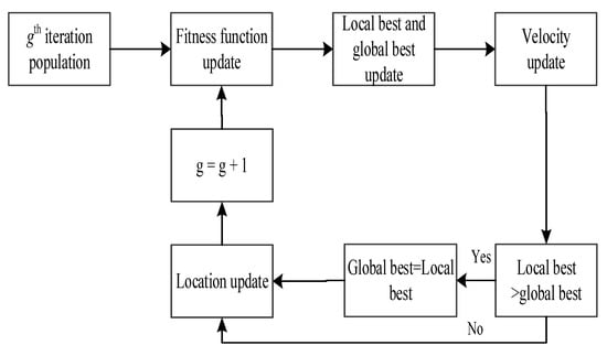 where ω is the inertial weight; and are the local and global attractive coefficients, respectively; and the represent the historical best local and global positions, respectively, in the whole swarm. is the factor of position updating. Therefore, the PSO algorithm may obtain a local optimal solution and retain multiple sub-optimal solutions. The flow chart of PSO is shown in Figure 1.