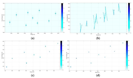Imaging results of the vessel scattering point model: (a) imaging result of a simulated stationary vessel; (b) imaging result of a simulated moving vessel; (c) imaging result of classical PSO; (d) imaging result of co-evolutionary PSO.