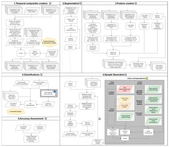 In all six workflows, temporal (seasonal or monthly), composites of S1 and S2 imagery were created at first, followed by image segmentation for object creation within Google Earth Engine (GEE). In the feature set creation step, different feature sets were generated per-object, considering either all available EO data or a reduced subset of features excluding the S2 original bands. Consequently, sample objects were identified based on a fully automated and a manual sample identification strategy. Finally, a Random Forest (RF) classification algorithm was used for class discrimination in the respective training objects set (six in total). The six classification schemes were evaluated by analyzing their confusion matrices and the derived standard accuracy measures, to find the best performing workflow. The JavaScript code used in this study is available on GitHub [41] and runs on the Google Earth Engine Code Editor, after signing-in to the service and following the instructions.