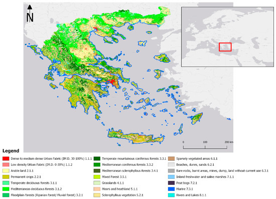 The study area is the terrestrial territory of Greece, including nearby coastal areas (2 km buffer). Greece covers an approximate area of 131,957 km2, with one of the largest coastlines in Europe of 15,021 km long, [19]. Geomorphologically, 78% of Greece’s area is covered by mountains [36] and has a highly diverse landscape. The climate, according to the Köppen–Geiger climate classification, is mainly temperate Mediterranean with large areas in northern Greece being classified as semi-arid and fewer areas, mostly in higher altitudes, classified as humid continental [37]. The combination of landscape and climate conditions together with Greece’s biological assets has led to the existence of a large ecosystem type variety, with forest habitats being the predominate habitat group covering 37% of the natural habitats in Greece [38].