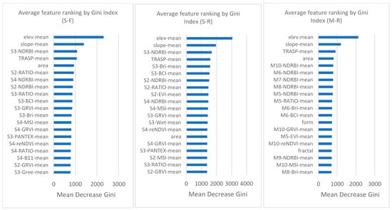 An additional by-product of the RF classification, which is calculated internally, is the variable importance. RF in GEE works by using the so-called Gini Index as a measure for the best split selection. Variable importance is measured by the OOB error increase and the Gini Index decrease, when switching one of the input random variables while keeping the rest constant. This measure helps identify the most influential predictor features in the classification and can sometimes be useful for model reduction [82,83].