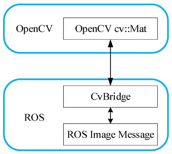 After successfully acquiring sensor data, ROS provided camera calibration, distortion correction, color decoding, and other underlying operations in the image pipeline. The data structures of RAW messages and compressed messages were inconsistent with that defined in OpenCV. Thus, for complex image processing tasks, the OpenCV, cv-bridge, and image-transport libraries were used to convert messages and process images topics that were published or subscribed to. On the contrary, when OpenCV processed images, its cv::Mat image could not be published directly on ROS, and it was necessary to convert it to an ROS Image message to publish it. The process of calling OpenCV in ROS is shown in Figure 4.