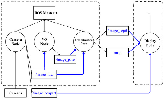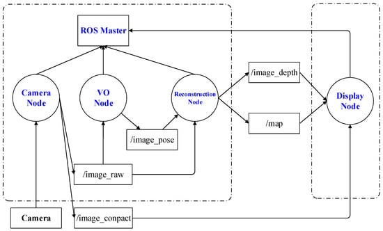 As shown in Figure 7, the camera node published the acquired sensor data to the topics /image_raw and /image_compact, where /image_raw consisted of original image data subscribed to by visual odometry (VO) node and the reconstruction node. The visual node, which did not require the original image, subscribed to the topic /image_compact to save communication overhead.