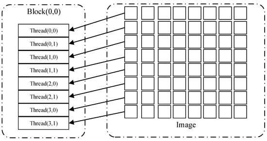 To fully explore the computing capability of the embedded equipment on the UAV platform and achieve real-time data processing in the course of UAV flight, by comparing several products available in the market, we selected the TX2 embedded development module as a processing platform for the experiment. Its core module size was only 50 mm × 87 mm. Because depth estimation tasks on pixels were independent of one another, the computation tasks for each pixel were simply assigned to a single thread (see Figure 6). In the CUDA architecture, a warp consisting of 32 threads was the smallest unit executed by a CUDA program. The number of threads in each block should be set to a multiple of 32 to achieve the best performance.