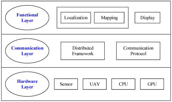 Based on the functionalities of its different parts, this system contained hardware and software components. The former included vision sensors, the UAV, embedded processors, and a GPU, and the latter consisted of programs to execute the core algorithm of visual SLAM. All components were connected by a distributed framework and a communication protocol to form a complete hardware and software system. The entire layout consisted of three layers, i.e., hardware layer, communication layer, and functional layer (illustrated in Figure 8).