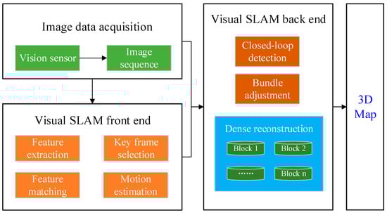 Vision-based SLAM (simultaneous localization and mapping) is a 3D “map-building” technology that estimates the trajectory of motion and then constructs the 3D information of the environment during the motion of the sensor [,,,]. Early implementation of SLAM for monocular vision was achieved using filters [,]. Chekhlov et al. [] and Martinez-Cantin et al. [] introduced the unscented Kalman filter (UKF) to improve the robustness of the Kalman filter algorithm but increased its computational complexity. In recent years, SLAM has been adapted rapidly to underwater robots, land robots, and UAVs [,,,,], and significant advances have been made in algorithm structure and data association problems [,,,]. Visual SLAM uses cameras as data acquisition sensors. It significantly enhances the capability of embedded systems to process a large amount of information due to its flexibility, low cost, efficiency, and ease of use. Classical SLAM algorithms include the extended Kalman filter (EKF) [], extended information filter (EIF) [], and particle filter (PF) []. However, these methods cannot solve the problem in the reconstruction of large-scale 3D “maps” [,,].