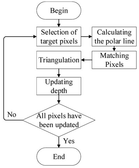 Compared with SfM, visual SLAM does not process a point cloud once it is ready but directly takes the point cloud model as result. As generating a model that can represent 3D information is not sufficient, the depth of as many non-feature point pixels as possible needs to be estimated in the image to build a dense 3D point cloud “map”.