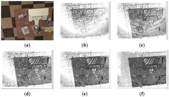 With significant improvements in hardware performance, the development of parallel computing technology, and the emergence of efficient solutions, keyframe-based monocular vision SLAM [,,,] has advanced, and graph-based optimization has become popular in SLAM research [,,,,,,,,,]. In dense SLAM reconstruction, Engel et al. constructed a semi-dense “map” in which the camera pose was calculated by dense image matching, and the depth of pixels with prominent gradient changes in the image is estimated []. Stühmer et al. estimated the camera pose using every pixel of a given image and constructed a dense 3D model based on it []. Progress has also been made [,] in improving the robustness of SLAM by predicting the depths of pixels and extracting image blocks. The large-scale direct monocular SLAM (LSD-SLAM) algorithm proposed by Engel et al. [] improved the accuracy of camera pose estimation and creates semi-dense, large-scale environmental “maps”. Based on visual SLAM, Liu et al. proposed a 3D modeling technology using UAV monocular video that relies only on the visual mode and does not need additional hardware equipment to assist in the construction of the 3D “map” of the shooting area in the video []. The experimental evaluation of the algorithm’s construction results verified its feasibility. Elena et al. proposed a 3D reconstruction method based on LSD-SLAM []. By analyzing video data and extracting keyframes, they generated 3D point cloud data and panoramic images. Finally, the 3D “map” was reconstructed by the fusion of the 3D point cloud and the panoramic image.