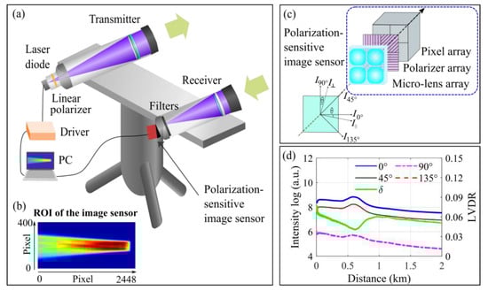 In previous work, a 450-nm PSI-Lidar prototype has been developed for atmospheric depolarization studies and a promising result has been achieved []. We hereby briefly introduce the PSI-Lidar system as an example. The 450-nm laser diode utilized has an output power of about 3.5 W. The laser beam is collimated by an achromatic lens (f = 600 mm, Φ = 100 mm), and the backscattering signal is collected by an achromatic lens (f = 100 mm, Φ = 50 mm). The polarization- sensitive image sensor is tilted for 7° with respect to the optical axis of the receiving lens. The receiver and the transmitter are mounted with an approximately 806 mm separation to each other to satisfy the Scheimpflug principle [,,]. Figure 1d shows the lidar signals at different polarization angles measured by the 450-nm PSI-Lidar system as well as the corresponding LVDR profiles.