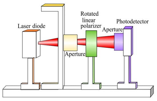 Table 1 gives the PER as well as the corresponding DoLP of multimode laser diodes at different wavelengths, which are obtained from datasheets provided by the suppliers. As can be seen, the PER of multimode laser diodes at 450 and 520 nm are typically in the region of 100-400 leading to a DoLP beyond 0.98. However, the PER value of the 808-nm laser diode is seldom provided by manufacturers. Thus, an experimental setup was developed to measure the PER (DoLP) of the laser beam emitted from the 808-nm laser diode. As shown in Figure 3, the laser beam emitted by the laser diode first passed through an 1-mm aperture and then a high-PER linear polarizer (>10,000:1), which can be considered as an ideal polarizer. A second aperture was installed in front of the amplified photodetector to suppress the stray light. The transmission intensity of the polarized laser beam through the linear polarizer was detected by the photodetector and then acquired by a data acquisition (DAQ) card for data analysis. The linear polarizer was manually rotated through a rotational polarizer mount from 0° to 360° with a step of 2°, and the transmission intensity through the linear polarizer is recorded for 8 s at each rotation angle of the linear polarizer. Figure 4 shows the relationship between the detected intensities and the rotation angles of the linear polarizer. The PER can be obtained by fitting the polarization response curve according to a cosine function. It has been found out that the PER of the 808 nm laser diode is about 68 ± 8, which is much smaller than those at shorter wavelengths.
