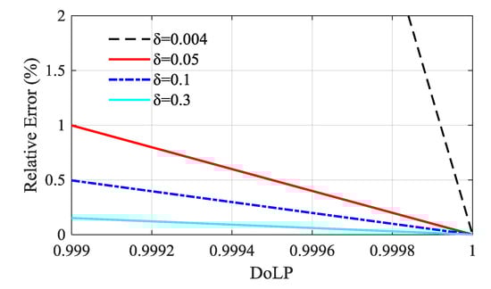 Here, is the DoLP of the laser beam that is transmitted into the atmosphere, is the true value of the LVDR, which is only dependent on the optical properties of the scatters (see Equation (12)). Figure 6 illustrates the relationship between the relative error and the DoLP of the transmitted laser beam at typical atmospheric LVDRs for molecules (0.004), anthropogenic aerosol (0.05), and dust (0.3) [,,]. As can be seen, the relative error decreases with the increasing of the DoLP, and increases when the LVDR becomes smaller. It can be concluded that the relative error of the LVDR would be limited to 1% even in the case of molecular depolarization ratio (≈0.004) if the DoLP of the transmitted laser beam can reach up to 99.992%.