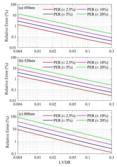The relationship between the relative error and the LVDR due to the PER uncertainty of ±2.5%, ±5%, ±10%, ±20% at three different wavelengths: (a) 450 nm, (b) 520 nm, (c) 808 nm.