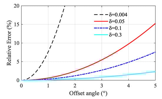 Simulation results of the relative errors introduced by the offset angle with different offset angles and LVDRs are shown in Figure 8. As can be seen, the relative error will increase with the increasing of the offset angle. Meanwhile, the relative error may increase considerably for a small value of the LVDR. The relative error introduced by the offset angle would be limited to 5% for the molecular depolarization of around 0.004, as long as the offset angle is smaller than 0.81°. The relative error can be further reduced to below 1%, if the offset angle is in the range of ±0.37°.