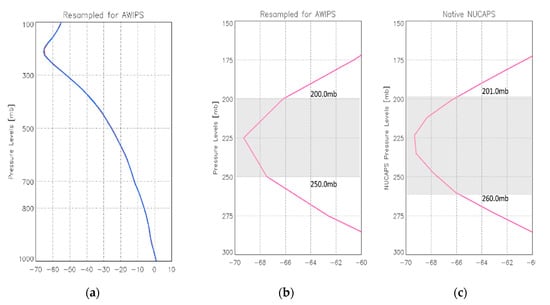 Figure 1a is an example of the impact of the vertical interpolation on the sounding. There are only slight differences between the resampled profile (blue) and the original sounding (pink). With the cold air aloft aviation hazard in mind, critical temperatures < −65 °C (gray shading in Figure 1b,c) are still identified in the vertically interpolated sounding, with only a 10 hPa difference between the bottom of the cold air aloft layer when comparing the interpolated and native NUCAPS temperature. Based on forecaster feedback, the slight differences in the 250–200 hPa layer are not significant enough to impact the integrity of the sounding or drastically change decisions related to forecasting applications.