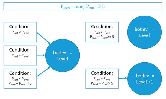 where P is the array of 100 NUCAPS pressure levels, surface pressure (Psurf) is obtained from the Global Forecast System as part of the NUCAPS algorithm, and botlev is the bottom-level pressure index found using one of the three conditions in Figure 2. Then, the surface temperature (Tsurf) is calculated by Equation (5) as follows: