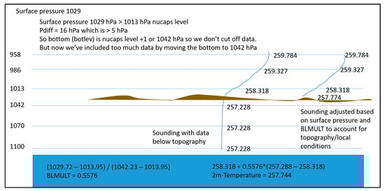 Ideally, prior to vertical interpolation and horizontal gridding, the bottom of each sounding should be found based on comparing the surface pressure to the NUCAPS pressure levels. Correctly adjusting the surface and boundary layer conditions according to local changes in topography and surface pressure benefits the interpretation of satellite soundings and prevents the propagation of systematic uncertainty in derived geophysical variables (i.e., lapse rate, stability indices). Note that NUCAPS sounding files include 100 levels from 1100 hPa (P100) up to top of the atmosphere (0.0016 hPa; P1), and 1100 hPa is often below the Earth’s surface and unrepresentative of actual conditions. In the event that the Earth’s surface is higher than P100, the remainder of the pressure grid is filled in with values identical to surface temperature, thus creating an isothermal profile below the surface. The technique outlined in Figure 2 removes any isothermal layer from the NUCAPS sounding and correctly assigns the bottom level. This technique to find the bottom portion of the sounding is implemented in the current AWIPS capability. This technique can be taken one step further to adjust the boundary layer temperature and moisture values in the sounding. The boundary layer multiplier (BLMULT; Equation (4)), can be calculated to either narrow or broaden the boundary layer to within 0.2 to 1.2 hPa. Then, a representative fraction of the temperature or moisture can be added or removed from the bottom of the sounding. Since the NUCAPS level closest to the surface pressure will never be an exact match, BLMULT can account for this discrepancy. BLMULT is calculated by: