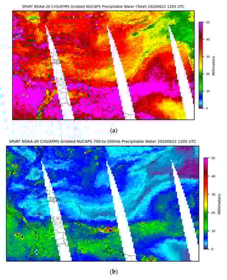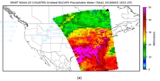 During the 2019 HWT Spring Experiment, NUCAPS soundings were used in the analysis of convection that developed in central Illinois on 5 June [,]. A line of storms developed in southern Iowa, and moved southeast into central Illinois by 1600 UTC. Figure 4a shows the Gridded NUCAPS TPW values around 30 mm over the region, while closer analysis of 700–500 hPa LPW indicates a drier layer in southern Illinois. This same dry signature is also evident in the 700 hPa relative humidity. Although not shown, the near-surface LPW and relative humidity fields indicate a relatively moist near-surface environment. The storms developed along a swath of regionally higher LPW and relative humidity, and increased in intensity during the afternoon hours, before decreasing in overall intensity after moving into the environment with drier air in the mid-levels (e.g., around 2200 UTC, approximately 3.5 h after the NOAA-20 overpass). The Storm Prediction Center storm reports indicate that most of the wind damage associated with the line occurred between 2030 and 2220 UTC []. This analysis shows the advantage of plan-view analysis to assess the environment, especially with more reliable fields that are above the boundary layer influence. Interrogating individual NUCAPS profiles can provide valuable temperature and moisture measurements, especially above the boundary layer. However, because soundings are volume measurements and not point observations, near the surface the soundings may underestimate important stability indices or features such as inversions when compared with radiosondes. In the June 5 case, the forecaster found NUCAPS vertical sounding Convective Available Potential Energy (CAPE) values were underestimated in the low to mid-levels when compared to the immediate Lincoln, Illinois sounding, which was valid at 1700 UTC []. The gridded fields allow the end user to assess the broad environment quickly and above the boundary layer, with a focus on changes in gradients and patterns.