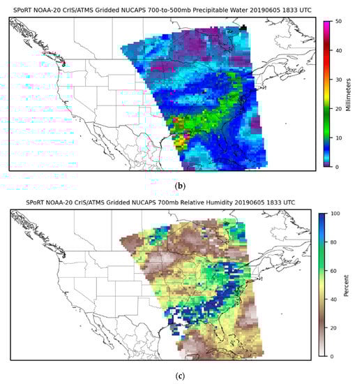 NOAA-20 Gridded NUCAPS on 5 June 2020, 1833 UTC (a) total precipitable water (TPW), (b) 700–500 hPa layer precipitable water (LPW), and (c) 700 hPa relative humidity.