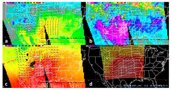 Advanced Weather Interactive Processing System (AWIPS) display of the 12 April 2018 Suomi-National Polar-orbiting Partnership (S-NPP) Gridded NUCAPS 1839 and 2021 UTC overpass and Rapid Update (RAP) model 2000 UTC analysis. (a) Gridded NUCAPS 2 m temperature, RAP surface wind, and mean sea level pressure; (b) Gridded NUCAPS 2 m relative humidity, RAP surface wind, and mean sea level pressure; (c) Gridded NUCAPS 700 hPa temperature and RAP 500 hPa wind and height; (d) RAP 700 hPa temperature, 500 hPa wind and height. Note that the AWIPS regional localization prevents the display of RAP on a full conus domain.