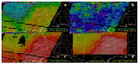 The horizontal gridding is performed on temperature, relative humidity, and additional derived fields. Each array of aggregated soundings is added to a 0.5° latitude/longitude grid over a global domain using nearest neighbor and minimal interpolation. Regions outside the swath are masked where data are unavailable before the gridding takes place. Horizontal fields are created for temperature and relative humidity on 41 standard levels and at the surface (e.g., 2-m), quality flags, and derived single layer products: total precipitable water (TPW) and layer precipitable water (LPW), total ozone, ozone anomaly, and tropopause level are also gridded. In AWIPS, the data are output as a grid record and made available for display. The derived parameters in AWIPS are leveraged to calculate and display additional fields such as lapse rates, theta-e/theta-e lapse rates, Haines Index, and other stability parameters derived from temperature and moisture. The derived parameters are baseline python functions in AWIPS that perform calculations on model and even satellite data to “derive” fields for display. Given that Gridded NUCAPS is ingested as a grid record, akin to model data, any derived parameter that uses temperature or moisture fields for its derivation can be calculated and displayed. Therefore, a wide array of display fields are available through AWIPS-derived parameters. Some fields derived by AWIPS such as stability indices that rely on levels within the boundary layer still need further evaluation for accuracy and efficacy. The specific variables and levels/layers presented here were chosen based on operations-to-research feedback gathered during annual participation in the HWT spring experiment [,,].