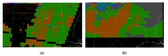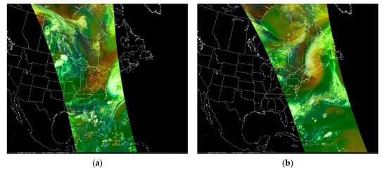 NUCAPS is a multi-step retrieval system that we will not describe in-depth, but it is worth highlighting how NUCAPS retrieves soundings in cloudy atmospheres, because this has direct relevance to discussions here. NUCAPS uses a technique called “cloud clearing” [,,] to derive a cloud-free radiance estimate from each cluster of 9 CrIS radiances (3 × 3 fields of view). This technique is a simple, robust means with which to remove the effects of clouds from the measured radiances without prior knowledge of clouds or the requirement for complex radiative transfer calculations through clouds. With cloud clearing, NUCAPS retrievals in partly cloudy scenes can be interpreted as the state of the atmosphere around or past the clouds, not through the clouds. Cloud clearing does reduce the spatial resolution of NUCAPS retrievals, since a sounding is retrieved for every aggregate of 9 CrIS fields of view (~50 km at nadir and ~150 km at the edge of the scan), but it significantly increases the retrieval yield to a ~75% success rate from a global set of measurements and allows sounding observations in complex, partly cloudy scenes to characterize the environment within storms. Another aspect of NUCAPS is that it retrieves temperature and moisture twice—first from a microwave-only (MW-only) set of ATMS channels [,,], and second from a set of infrared plus microwave (IR + MW) channels [,]. Both MW-only and IR + MW retrievals are part of the NUCAPS product, but only the latter is available in AWIPS. The MW-only retrievals contribute to evaluating whether the IR + MW retrievals failed or succeeded.