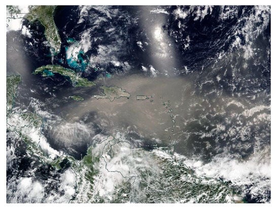 - Kuciauskas, A.P.; Xian, P.; Hyer, E.J.; Oyola, M.I.; Campbell, J.R. Supporting Weather Forecasters in Predicting and Monitoring Saharan Air Layer Dust Events as They Impact the Greater Caribbean. Bull. Am. Meteorol. Soc. 2018, 99, 259–268. [Google Scholar] [CrossRef]